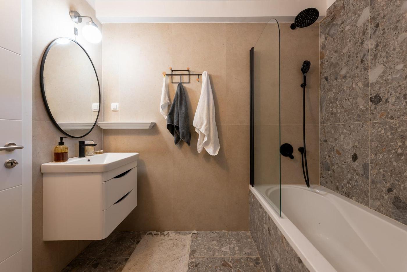 Three-Bedroom Apartment with Balcony. The private pool is a top feature of this apartment. This spacious apartment comes with 1 living room, 3 separate bedrooms and 2 bathrooms with a bath and free toiletries. Guests will find a stovetop, a refrigerator, a dishwasher and kitchenware in the kitchen. The apartment also includes a barbecue. The air-conditioned apartment features a flat-screen TV with streaming services, a washing machine, a tea and coffee maker, a dining area as well as sea views. The unit has 5 beds.