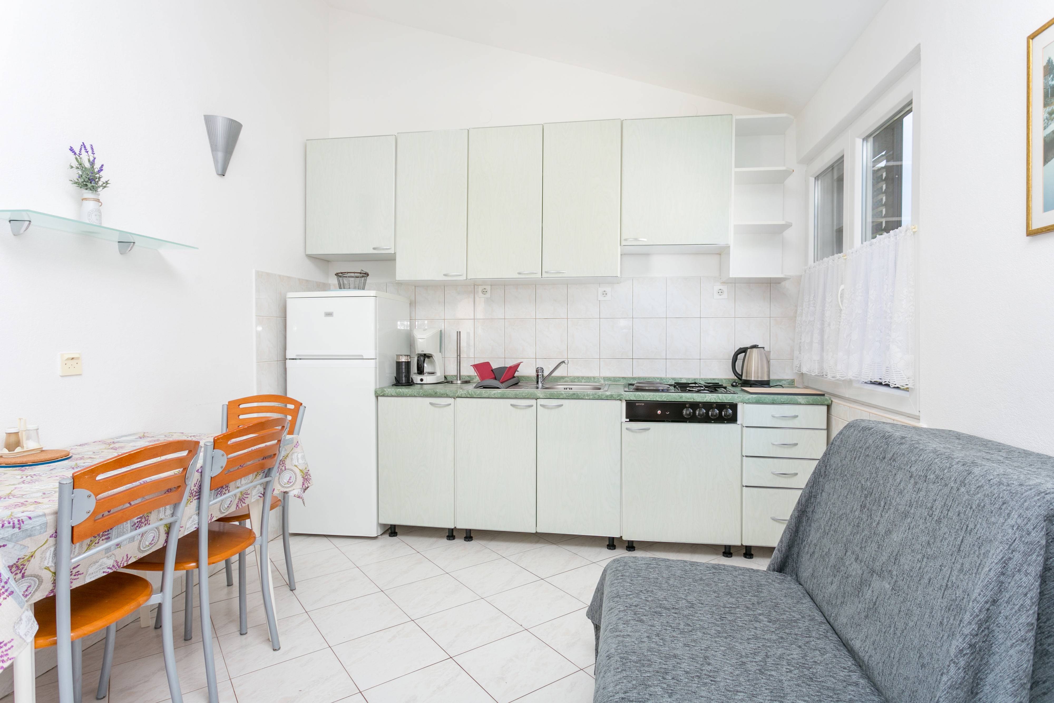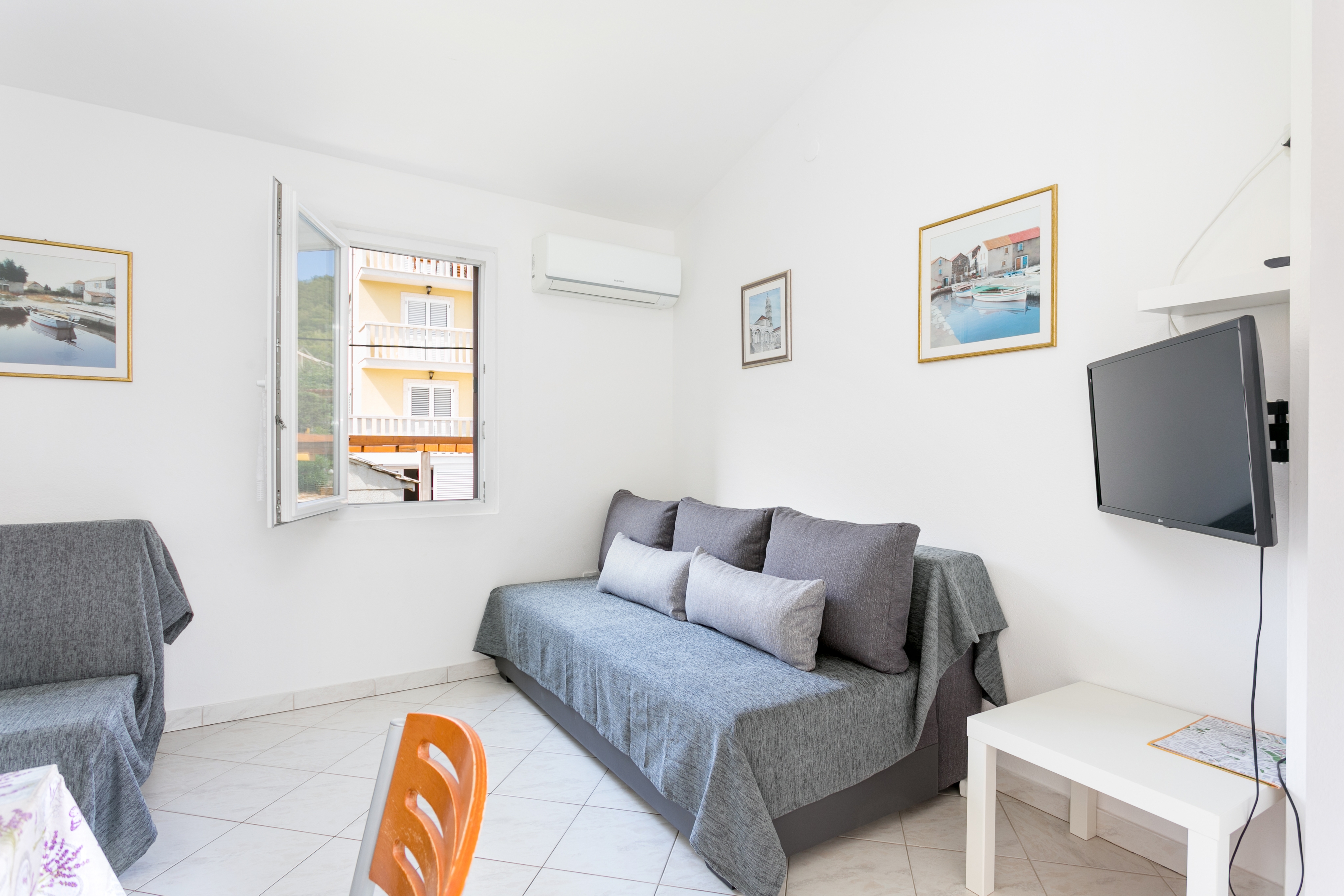 Apartment can accommodate 4 guests. Beds are situated in 1 sleeping rooms, but also in the living room, within 30m2. Guests can use a private balcony to enjoy the warm summer evenings. The apartment offers the sea view. Food can be prepared using barbecue which is shared with other guests too. INCLUDED IN THE PRICE: tourist tax, final cleaning, air-conditioning, parking, internet, baby cot, iron, ironing board, hairdryer. OBLIGATORY ADDITIONAL COSTS: short stay fee (surcharge depending on a number of booked nights: 30% - 1, 20% - 2, 10% - 3). The availability of additional services for your chosen dates of stay, as well as their prices (if none are listed) must be checked ahead of time. Any additional services not shown in the price calculation are payable directly to the property owner and only if used by the visitor.