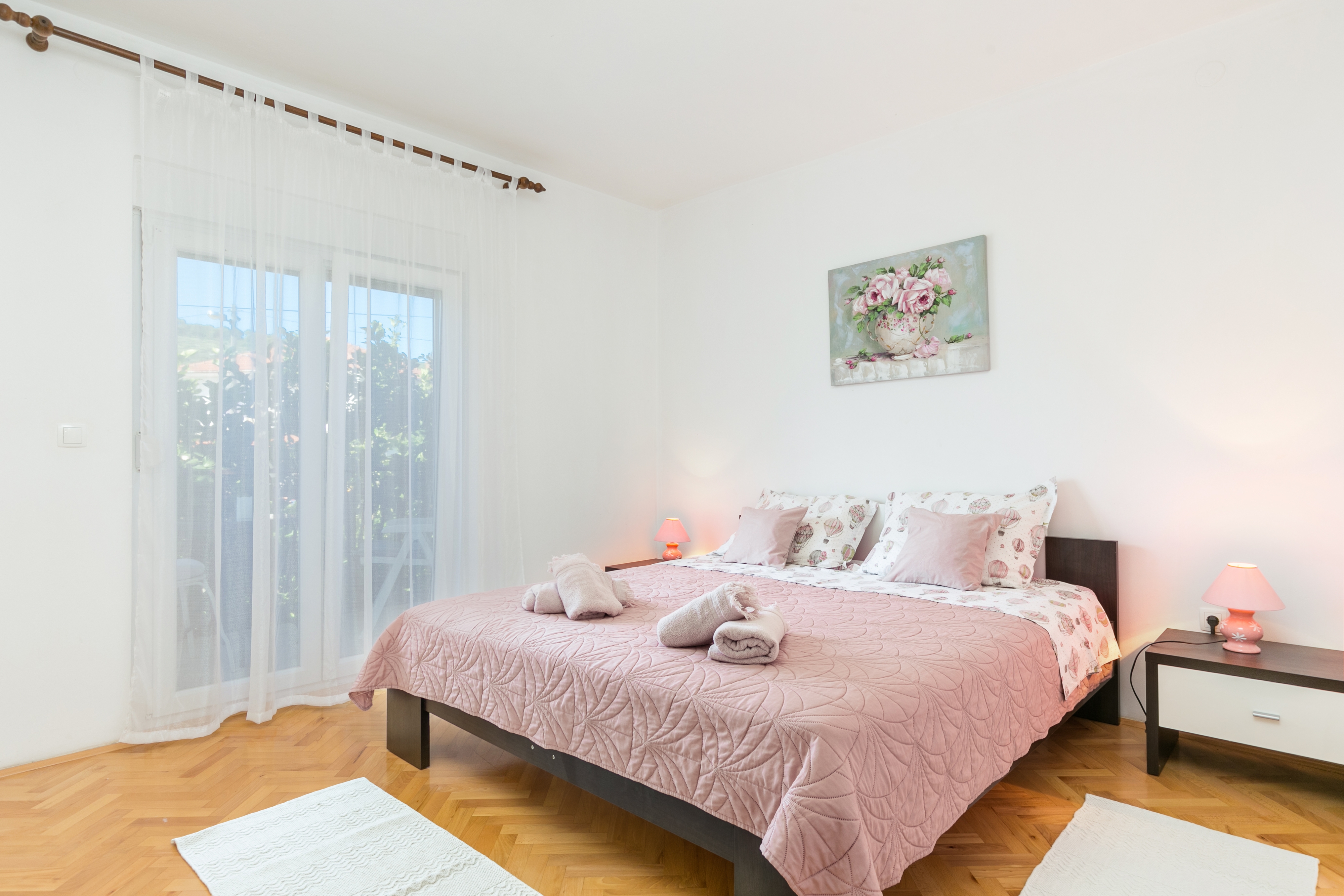 Apartment can accommodate 8 guests. Beds are situated in 3 sleeping rooms, but also in the living room, within 66m2. Guests can use a private balcony to enjoy the warm summer evenings. The apartment offers the sea view. Food can be prepared using barbecue which is shared with other guests too. This accommodation unit welcomes pets at an additional charge. INCLUDED IN THE PRICE: tourist tax, final cleaning, air-conditioning, parking, internet, baby cot, iron, hairdryer. OBLIGATORY ADDITIONAL COSTS: short stay fee (surcharge depending on a number of booked nights: 30% - 1, 20% - 2, 10% - 3). OPTIONAL ADDITIONAL COSTS: pets (€10.00 per night). The availability of additional services for your chosen dates of stay, as well as their prices (if none are listed) must be checked ahead of time. Any additional services not shown in the price calculation are payable directly to the property owner and only if used by the visitor. Discounts to the base price: free day 14=13 (for reservations of 14 or more days you get one free day for the stay until 31122026).