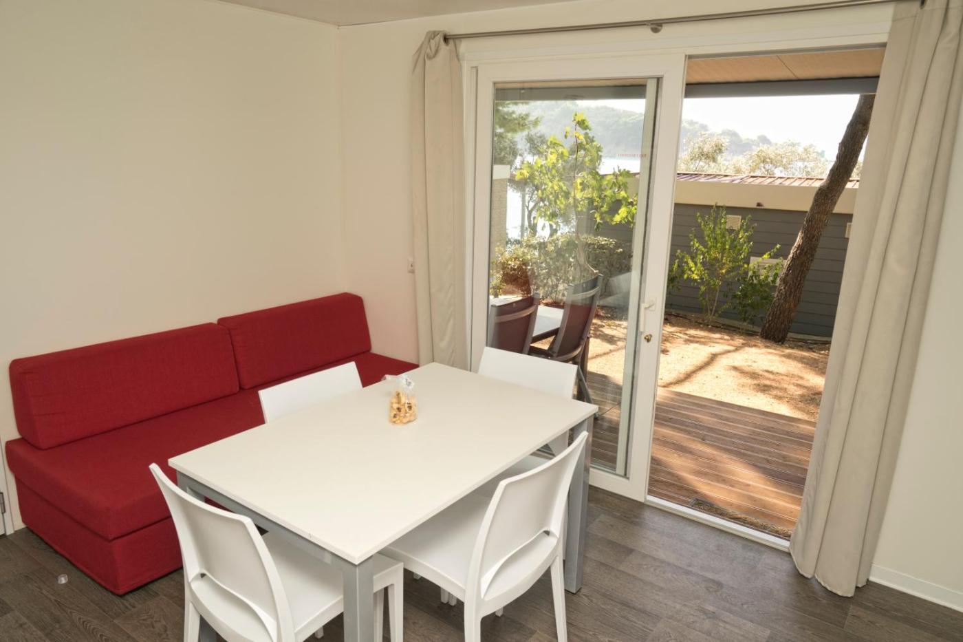 One-Bedroom Mobile Home with Terrace. This air-conditioned mobile home comes with 1 living room, 1 separate bedroom and 1 bathroom with a shower. Meals can be prepared in the kitchen, which features a stovetop, a refrigerator and kitchenware. The mobile home features a seating area, a wardrobe, a safe deposit box, as well as a terrace. The unit has 1 bed. ;