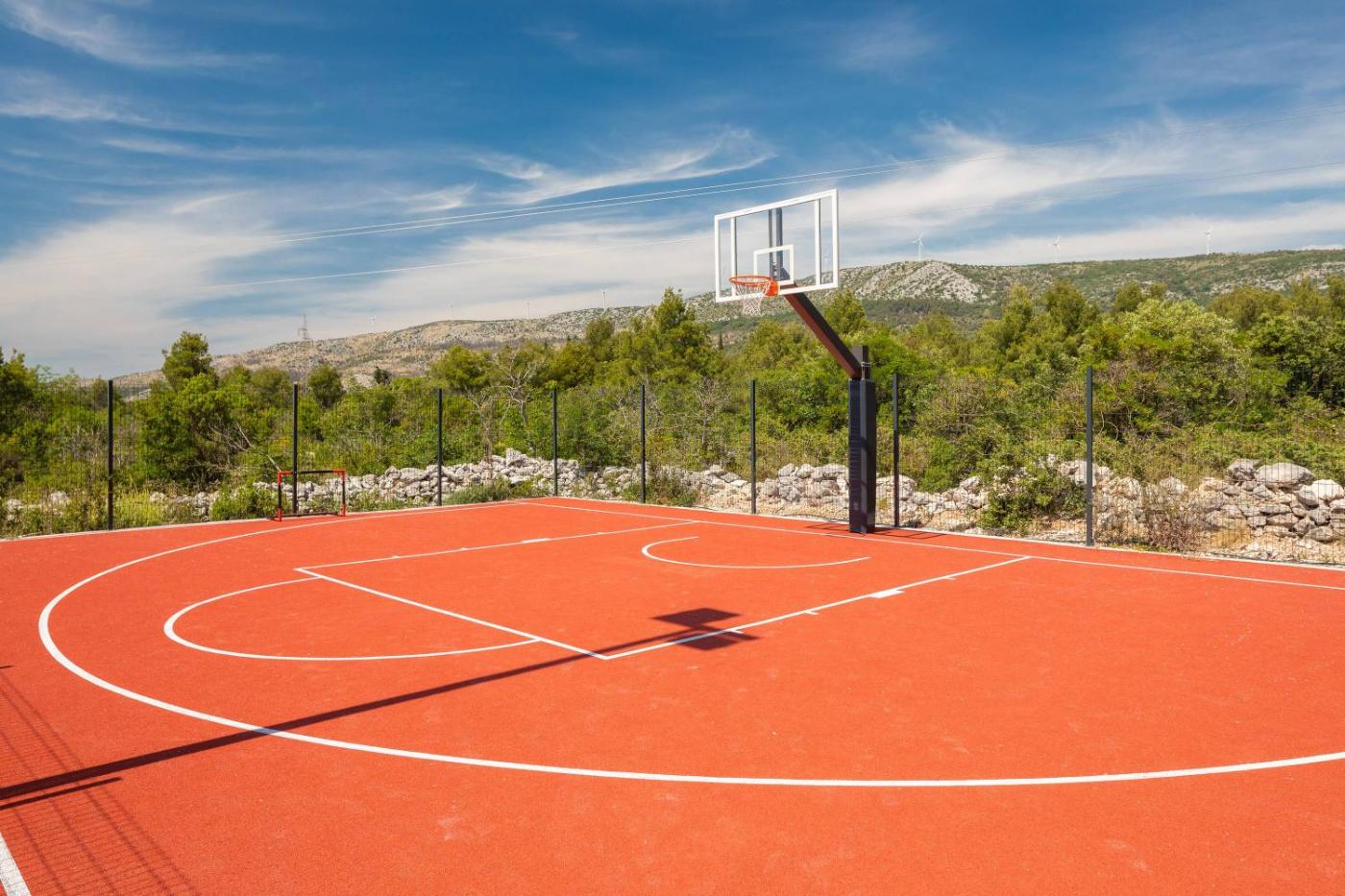 You can play table tennis, darts, and tennis at the 5-star villa. The villa features an outdoor fireplace and a childrens playground.