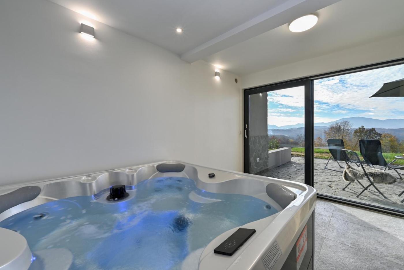 Two-Bedroom House. This luxurious holiday home offers a hot tub, a spa bath and a sauna. Featuring a private entrance, this air-conditioned holiday home consists of 1 living room, 2 separate bedrooms and 3 bathrooms with a shower and a hairdryer. Guests will find a stovetop, a refrigerator, a dishwasher and kitchenware in the well-fitted kitchen. The holiday home also offers a barbecue. Boasting a terrace with mountain views, this holiday home also provides a washing machine and a flat-screen TV with streaming services. The unit offers 3 beds.