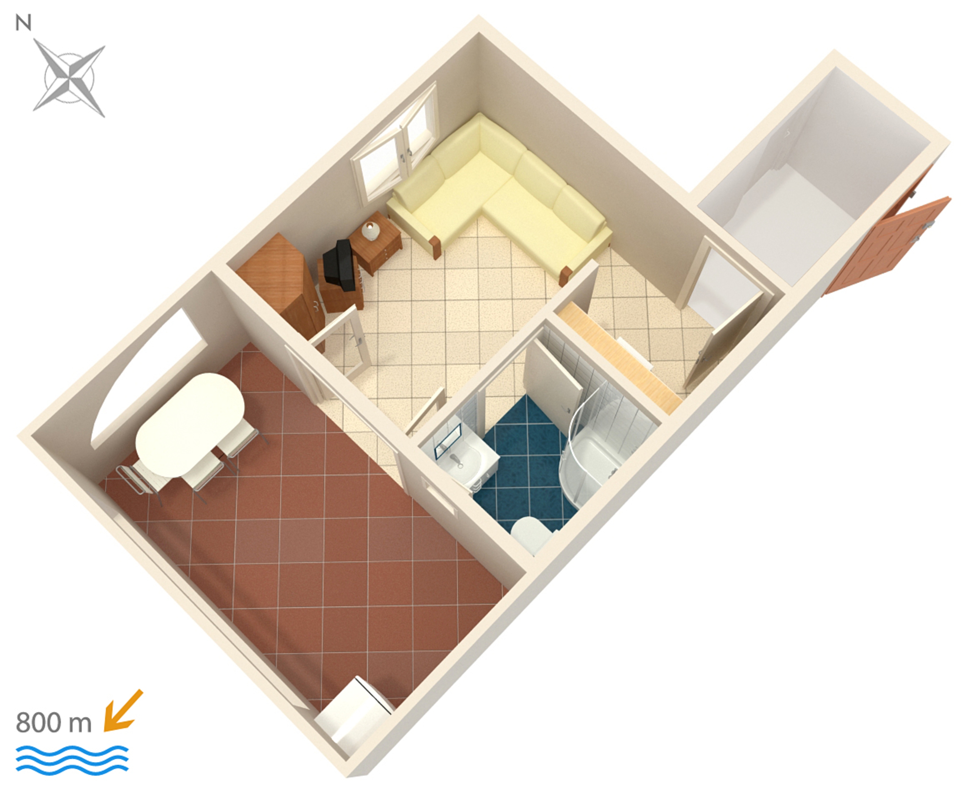 Studio flat can accommodate 2 guests. Beds are situated in living room, within 19m2. Guests can use a private terrace to enjoy the warm summer evenings. The studio offers the sea view. Food can be prepared using barbecue which is shared with other guests too. INCLUDED IN THE PRICE: tourist tax, final cleaning, air-conditioning, parking, internet. OBLIGATORY ADDITIONAL COSTS: short stay fee (surcharge depending on a number of booked nights: 30% - 1, 20% - 2, 10% - 3). The availability of additional services for your chosen dates of stay, as well as their prices (if none are listed) must be checked ahead of time. Any additional services not shown in the price calculation are payable directly to the property owner and only if used by the visitor.
