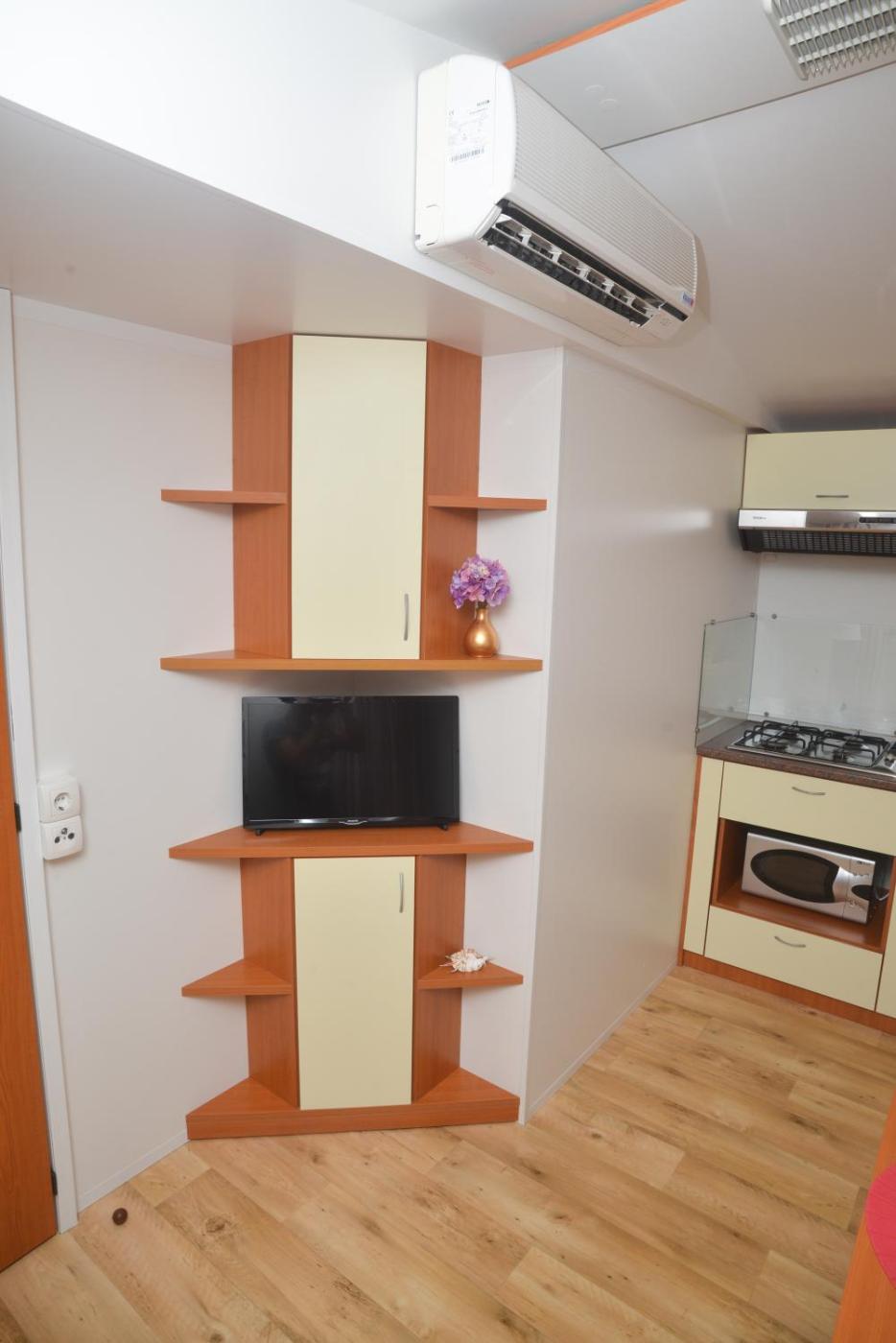 Mobile Home. Featuring a private entrance, this air-conditioned mobile home consists of a kitchen, 2 bedrooms and 2 bathrooms with a shower and a hairdryer. Guests will find a stovetop, a refrigerator, kitchenware and a microwave in the fully equipped kitchen. The mobile home also offers a barbecue. Boasting a terrace with sea views, this mobile home also provides soundproof walls and a flat-screen TV with cable channels. The unit offers 4 beds. ;