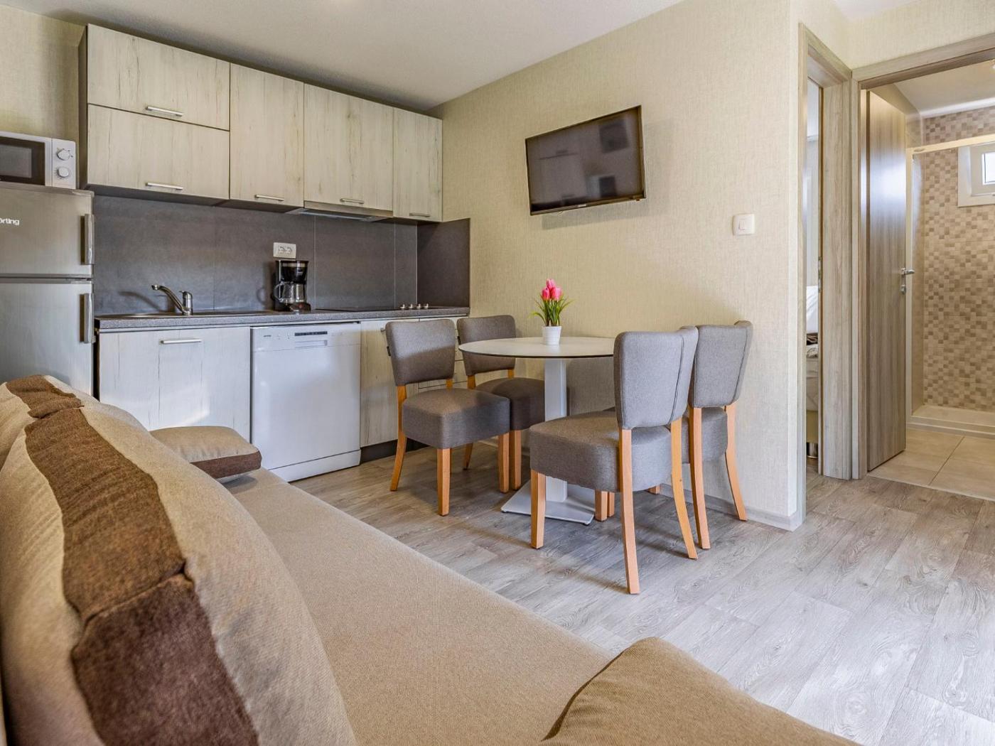 Holiday Home. This air-conditioned holiday home features 1 living room, 2 separate bedrooms and 2 bathrooms with a shower. Guests can make meals in the kitchen that has a stovetop, a refrigerator, a dishwasher and kitchenware. Boasting a terrace, this holiday home also features a coffee machine, a dining area and a TV with satellite channels. The unit has 4 beds.