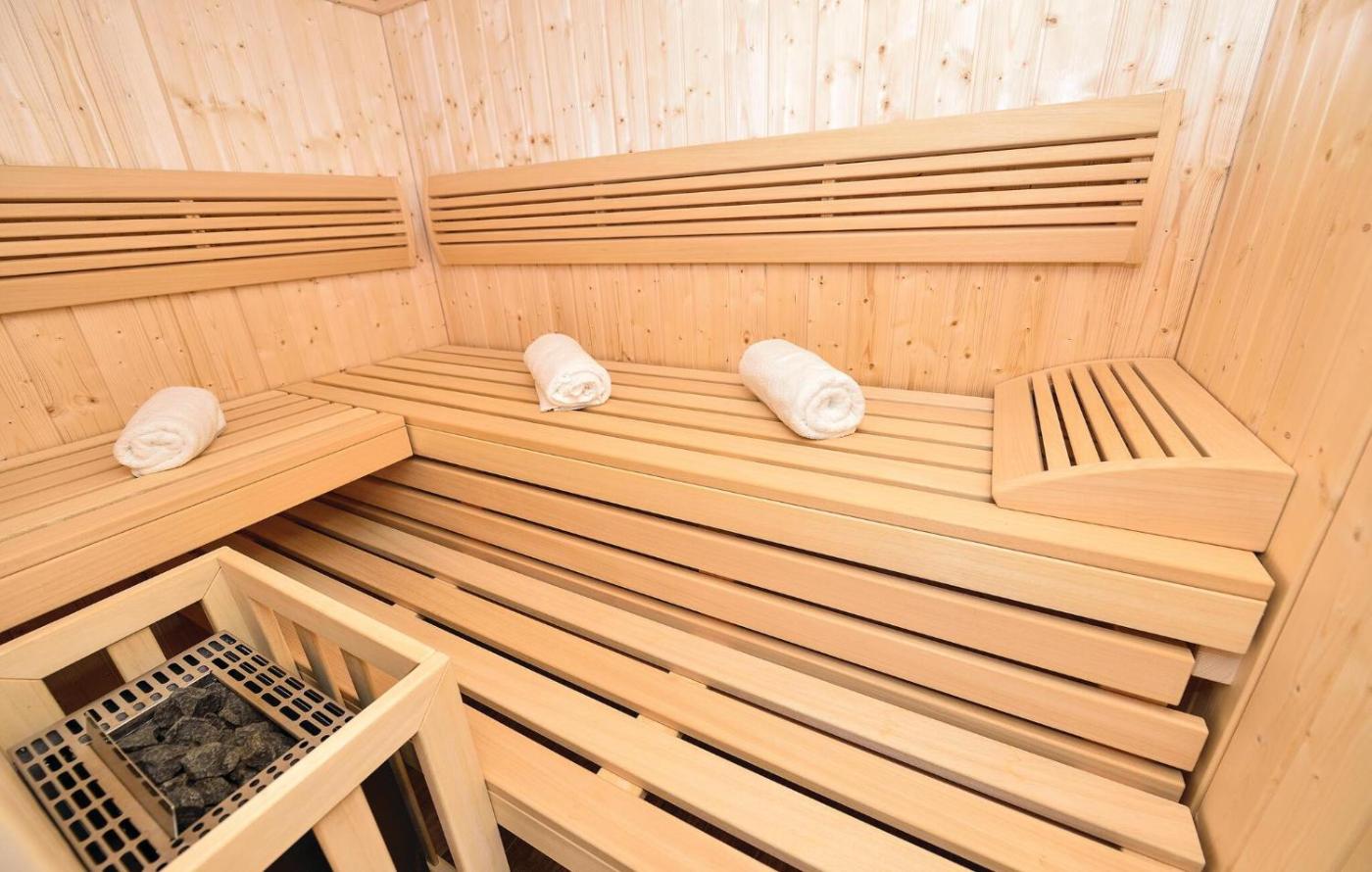 The apartment also offers an outdoor swimming pool and a sauna for guests to relax in.