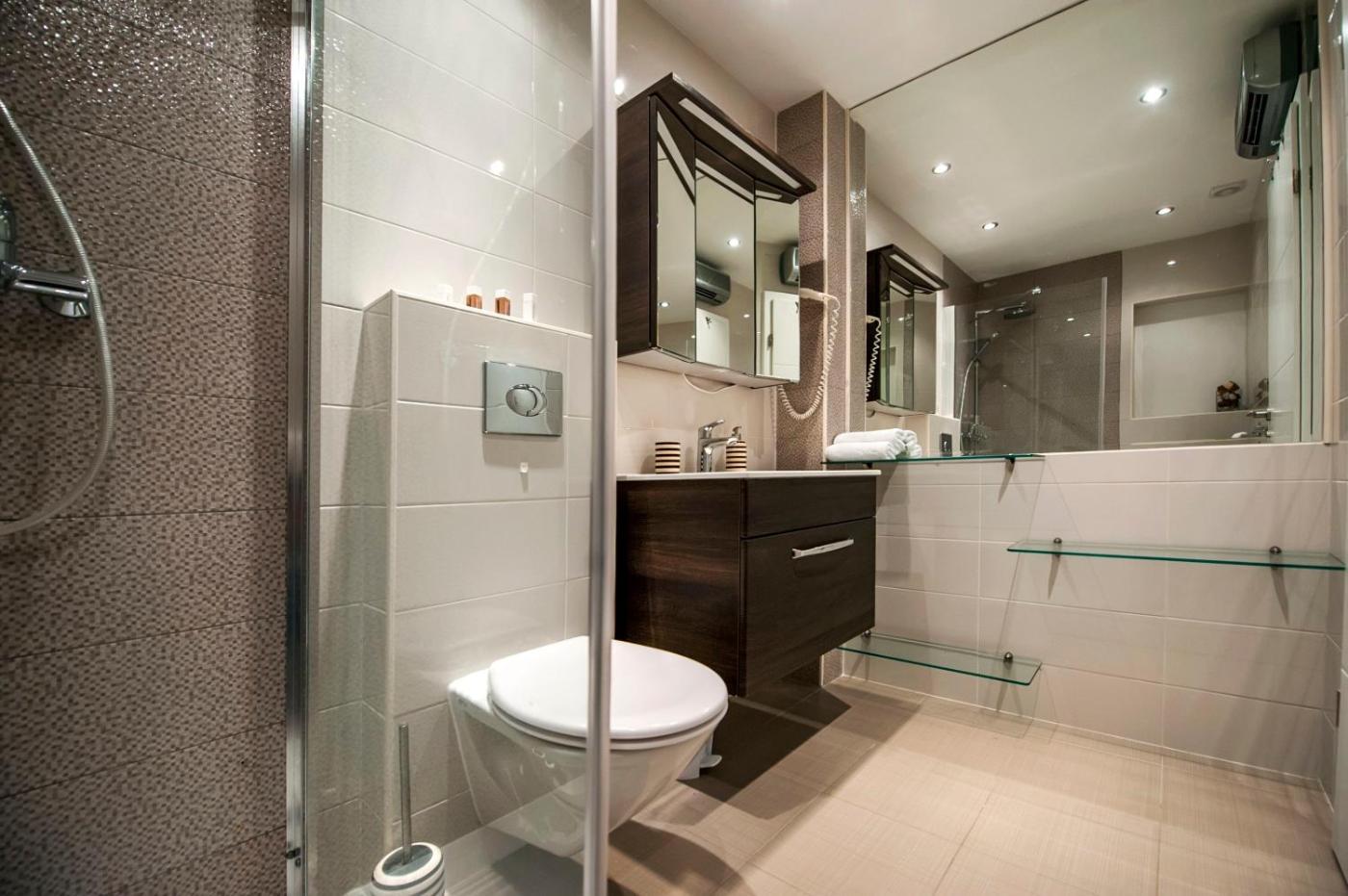 One-Bedroom Apartment. This spacious apartment includes 1 living room, 1 separate bedroom and 1 bathroom with a shower and free toiletries. Meals can be prepared in the well-fitted kitchen, which is fitted with a stovetop, a refrigerator, a dishwasher and kitchenware. The air-conditioned apartment offers a flat-screen TV with satellite channels, a private entrance, soundproof walls, a tea and coffee maker as well as sea views. The unit has 1 bed.