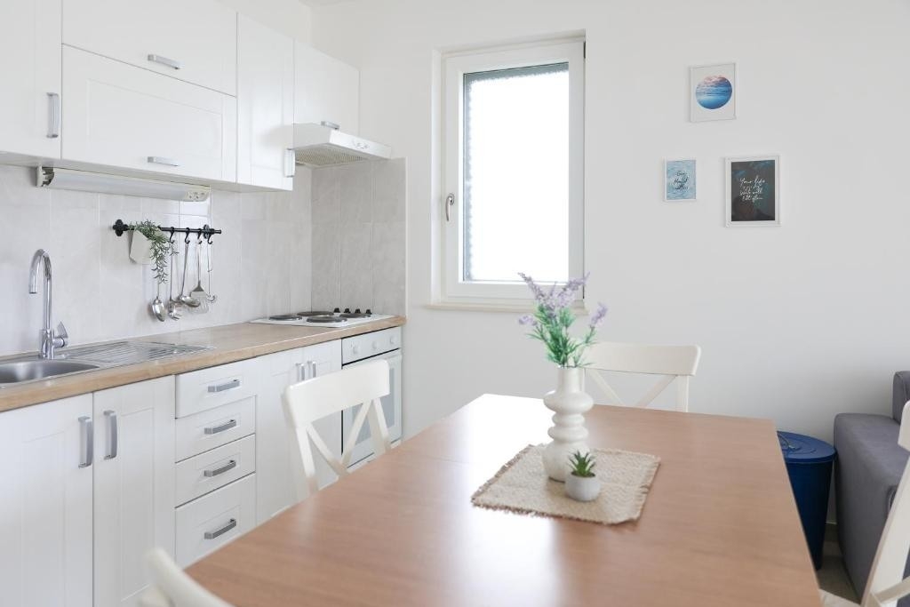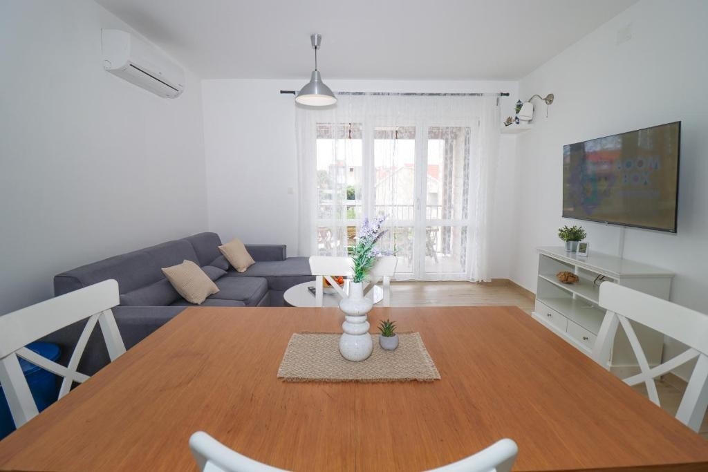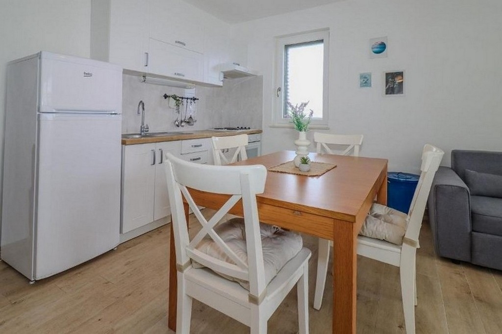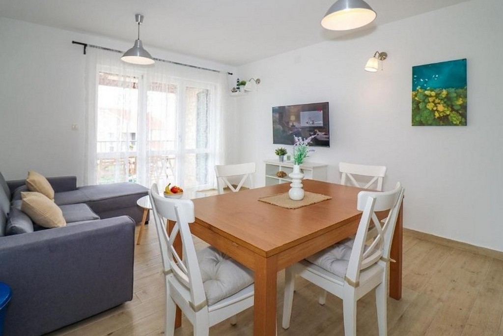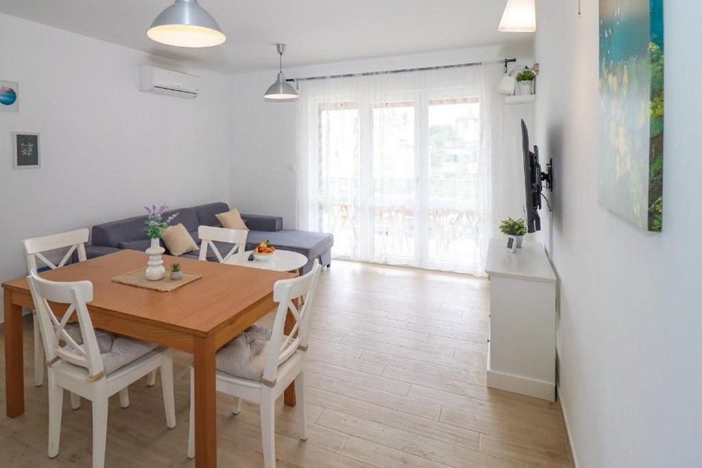 Apartment can accommodate 5 guests. Beds are situated in 2 sleeping rooms, but also in the living room, within 55m2. Guests can use a private balcony to enjoy the warm summer evenings. The apartment offers the sea view. Food can be prepared using barbecue which is shared with other guests too. Shared pool is on disposal during stay. INCLUDED IN THE PRICE: tourist tax, final cleaning, air-conditioning, pool, parking, internet, baby cot, iron, ironing board, hairdryer. The availability of additional services for your chosen dates of stay, as well as their prices (if none are listed) must be checked ahead of time. Any additional services not shown in the price calculation are payable directly to the property owner and only if used by the visitor.