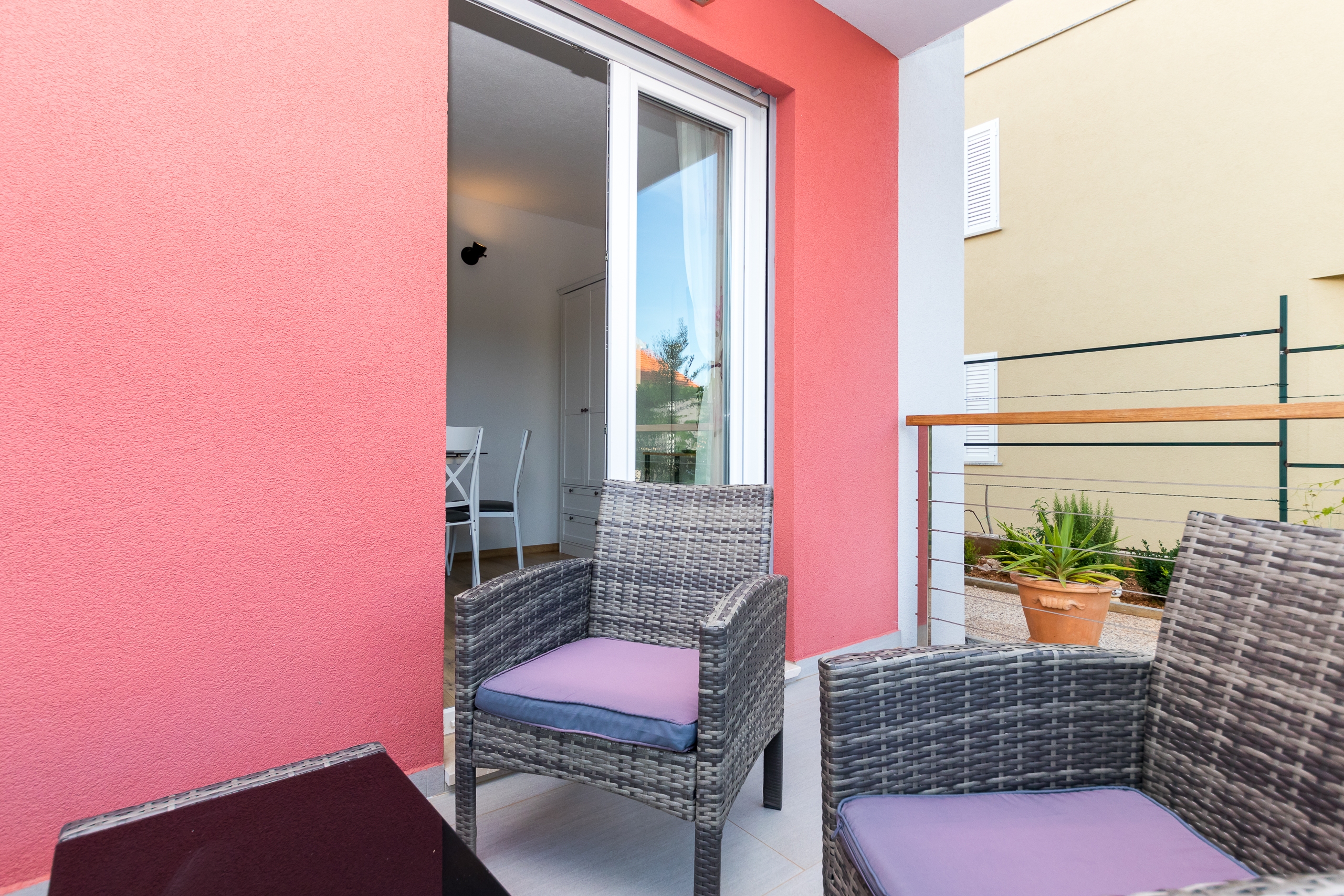 Room can accommodate 2 guests. Beds are situated in 1 sleeping rooms, within 20m2. Guests can use a private terrace to enjoy the warm summer evenings. Food can be prepared using barbecue which is shared with other guests too. This accommodation unit welcomes pets at an additional charge. Reserved accommodation unit is a room with its own bathroom and there is no usage of kitchen. INCLUDED IN THE PRICE: tourist tax, final cleaning, air-conditioning, parking, internet, iron, ironing board, hairdryer, portable barbecue, 1 bed for children (included in the price). OBLIGATORY ADDITIONAL COSTS: short stay fee (surcharge depending on a number of booked nights: 30% - 1, 20% - 2, 10% - 3). OPTIONAL ADDITIONAL COSTS: laundry (€5.00 washing), pets (€5.00 per night). The availability of additional services for your chosen dates of stay, as well as their prices (if none are listed) must be checked ahead of time. Any additional services not shown in the price calculation are payable directly to the property owner and only if used by the visitor. Discounts to the base price: free day 14=13 (for reservations of 14 or more days you get one free day for the stay until 31122026).