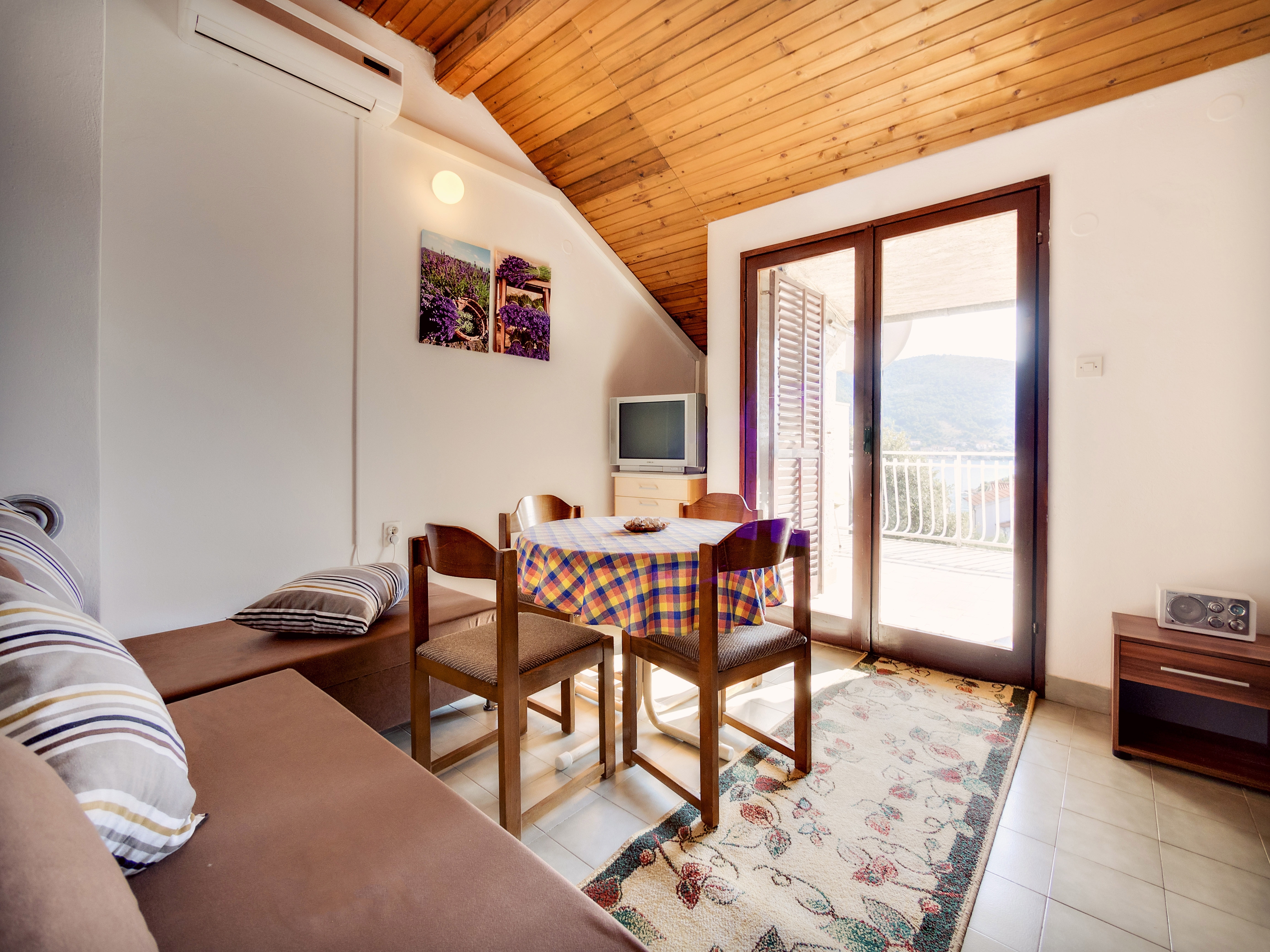 Apartment can accommodate 5 guests. Beds are situated in 2 sleeping rooms, but also in the living room, within 54m2. Guests can use a private terrace to enjoy the warm summer evenings. The apartment offers the sea view. Food can be prepared using barbecue which is shared with other guests too. INCLUDED IN THE PRICE: tourist tax, final cleaning, air-conditioning, parking, internet, iron, hairdryer, sunshade, sunchairs. OBLIGATORY ADDITIONAL COSTS: short stay fee (surcharge depending on a number of booked nights: 30% - 1, 20% - 2, 10% - 3). The availability of additional services for your chosen dates of stay, as well as their prices (if none are listed) must be checked ahead of time. Any additional services not shown in the price calculation are payable directly to the property owner and only if used by the visitor.