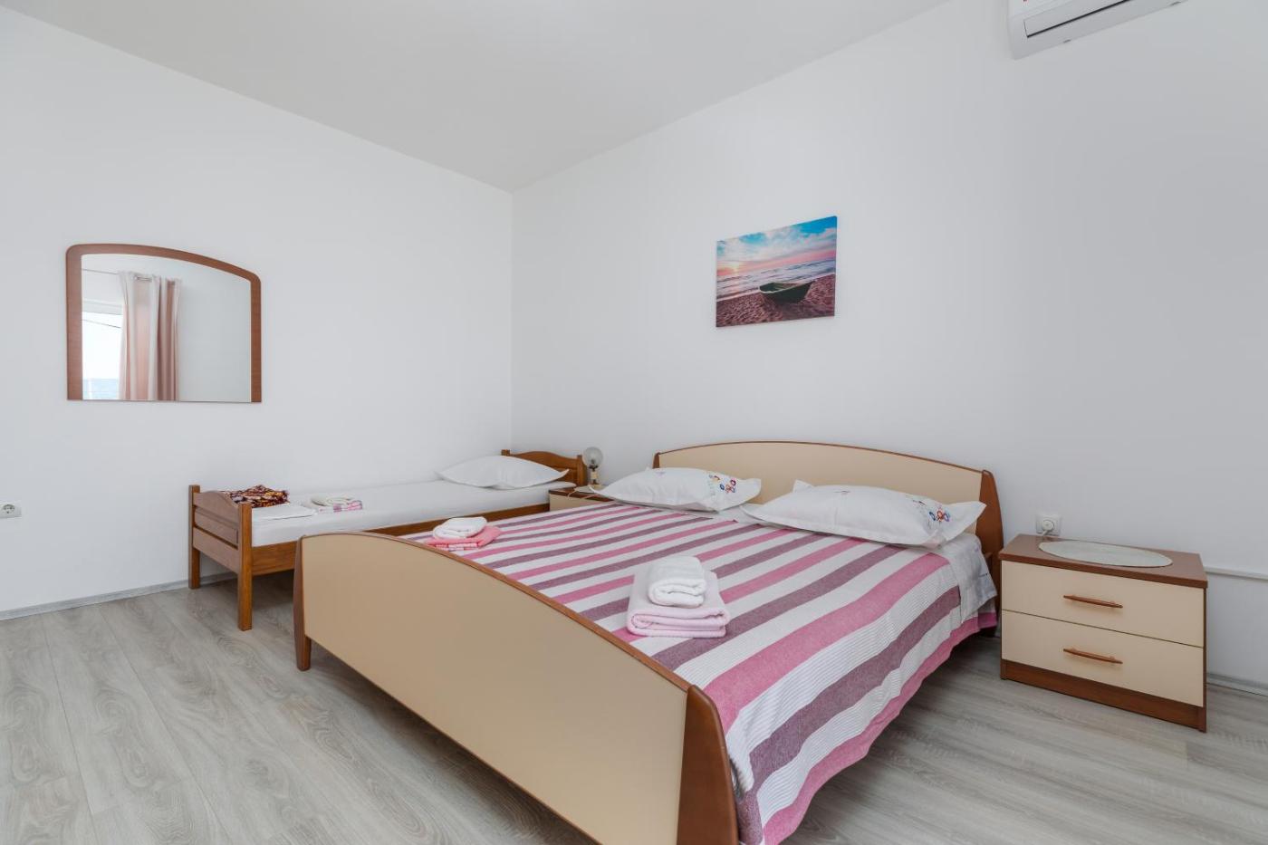 Three-Bedroom Apartment with Balcony and Sea View. Boasting a private entrance, this spacious apartment also includes 3 separate bedrooms, 1 bathroom with a shower, a kitchen and a dining area. In the fully equipped kitchen, guests will find a stovetop, a refrigerator, kitchenware and an oven. The apartment offers air conditioning, a washing machine, a seating area, a TV with satellite channels, as well as sea views. The unit has 5 beds.