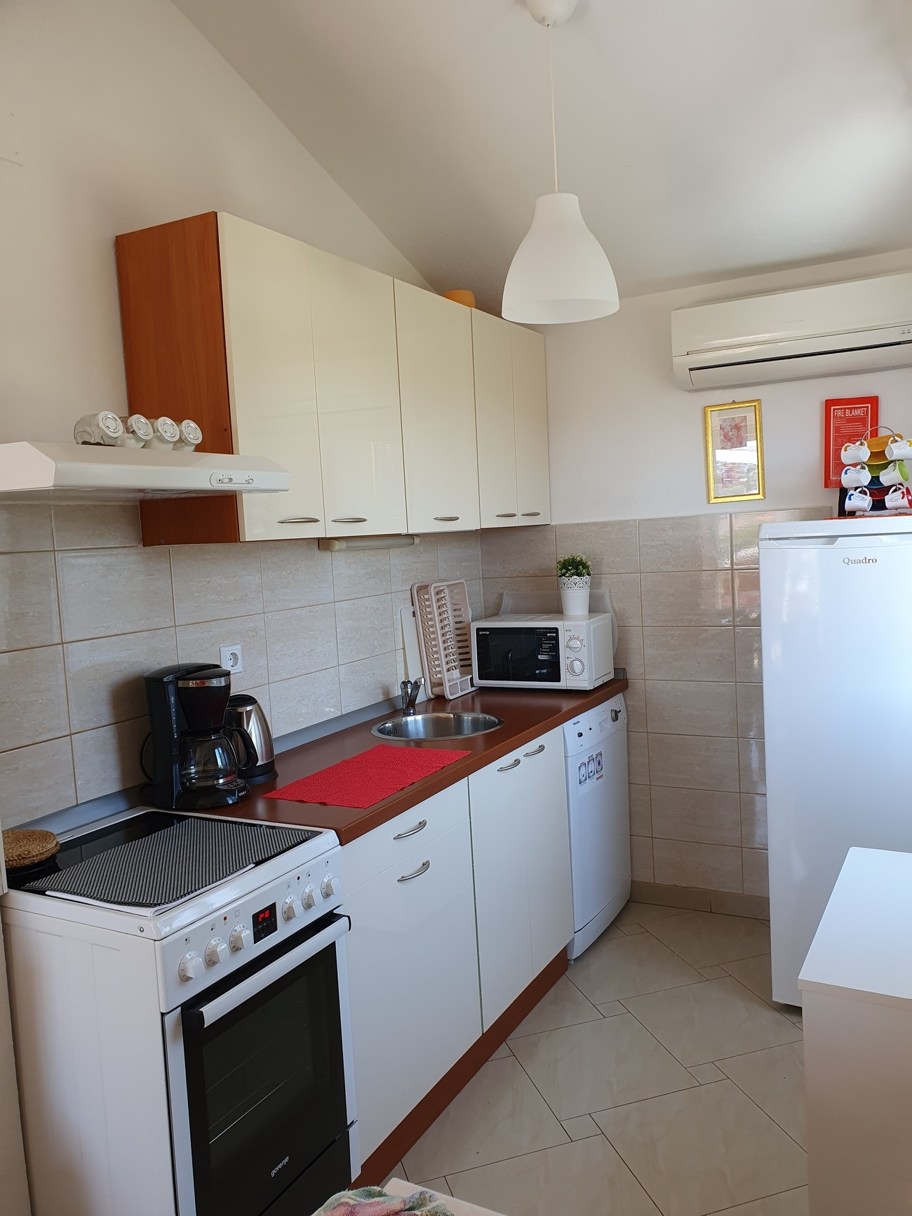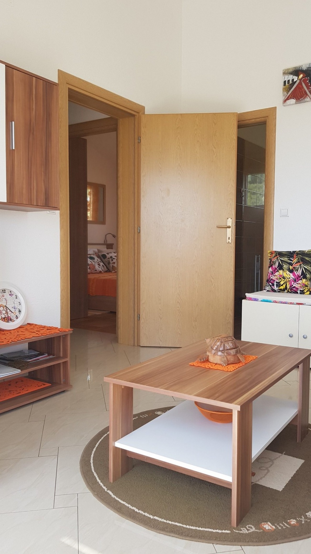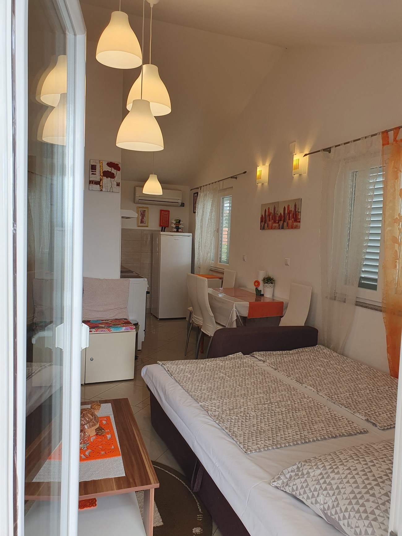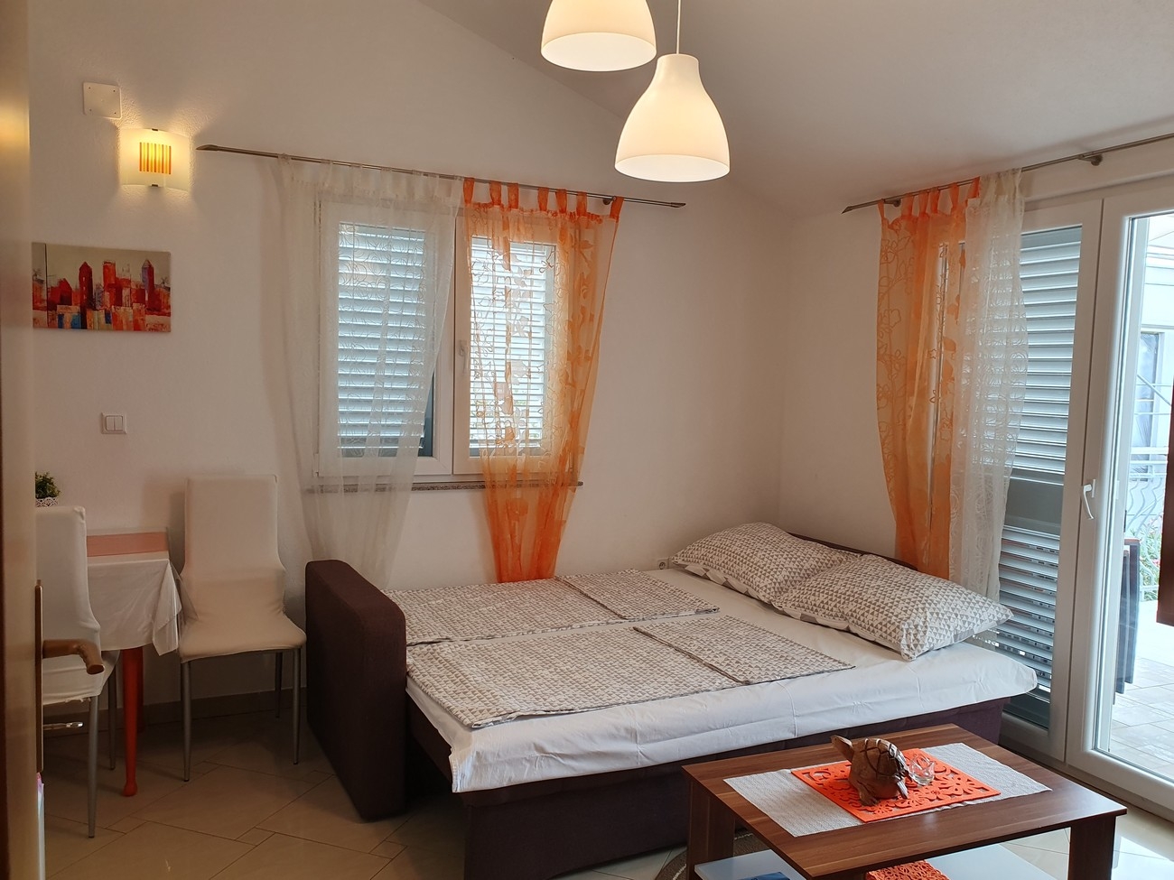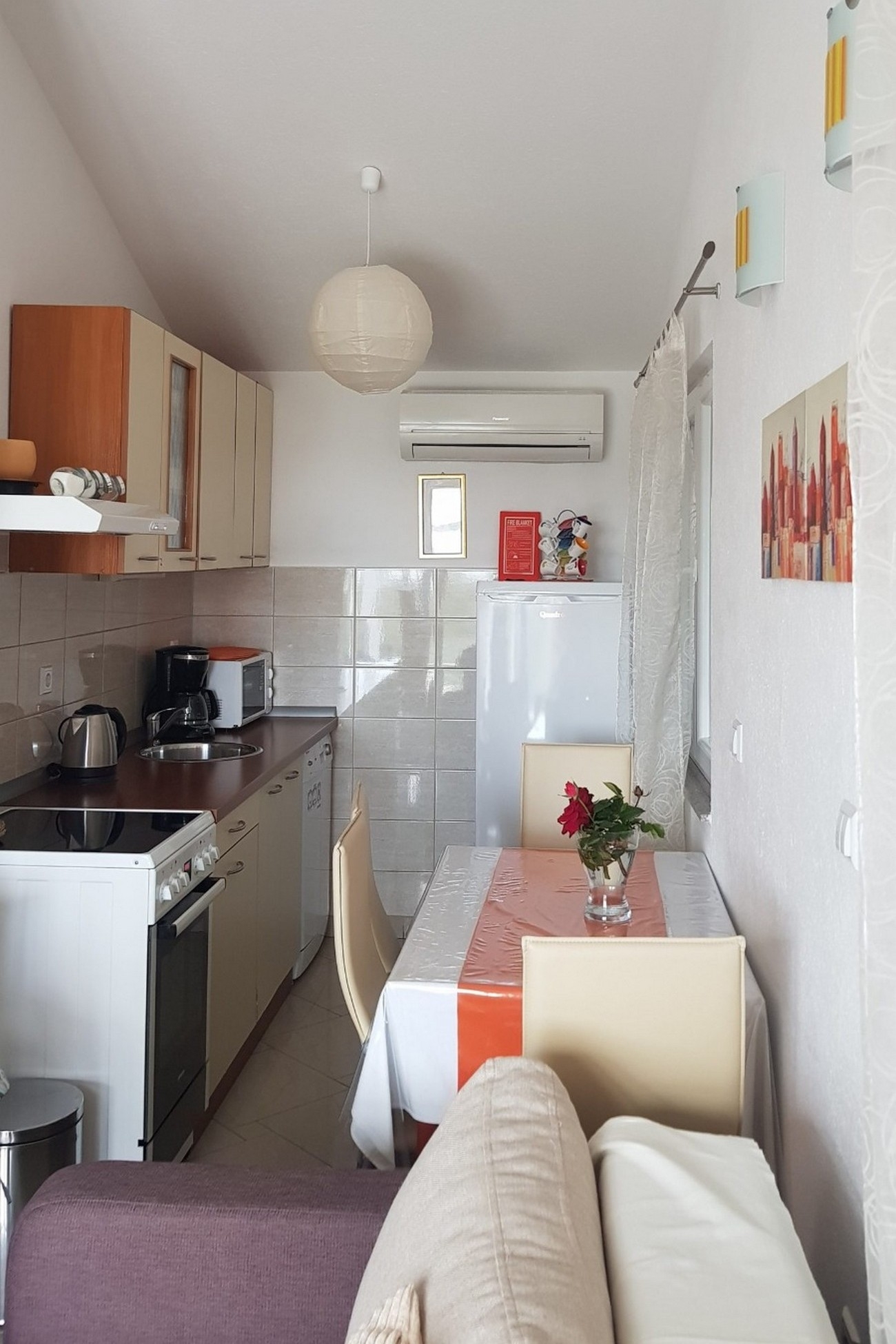 Apartment can accommodate 4 guests. Beds are situated in 1 sleeping rooms, but also in the living room, within 33m2. Guests can use a private terrace to enjoy the warm summer evenings. The apartment offers the sea view. Food can be prepared using barbecue which is shared with other guests too. INCLUDED IN THE PRICE: tourist tax, final cleaning, air-conditioning, parking, internet, bicycle, iron, ironing board, hairdryer, sunshade. OBLIGATORY ADDITIONAL COSTS: short stay fee (surcharge depending on a number of booked nights: 30% - 1, 20% - 2, 10% - 3). The availability of additional services for your chosen dates of stay, as well as their prices (if none are listed) must be checked ahead of time. Any additional services not shown in the price calculation are payable directly to the property owner and only if used by the visitor. Discounts to the base price: free day 14=13 (for reservations of 14 or more days you get one free day for the stay until 31122026).