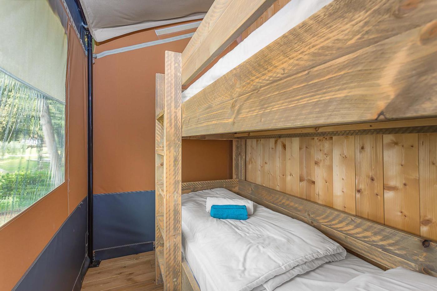 Safari tent sanitary + airco (6P). In the well-fitted kitchen, guests will find a stovetop, a refrigerator, kitchenware and a microwave. The tent provides air conditioning, a private entrance, a terrace with garden views as well as a private bathroom featuring a shower. The unit offers 5 beds. ;