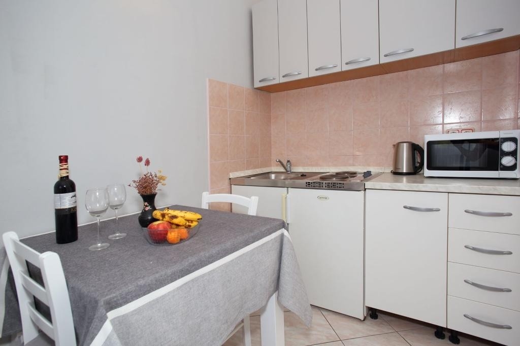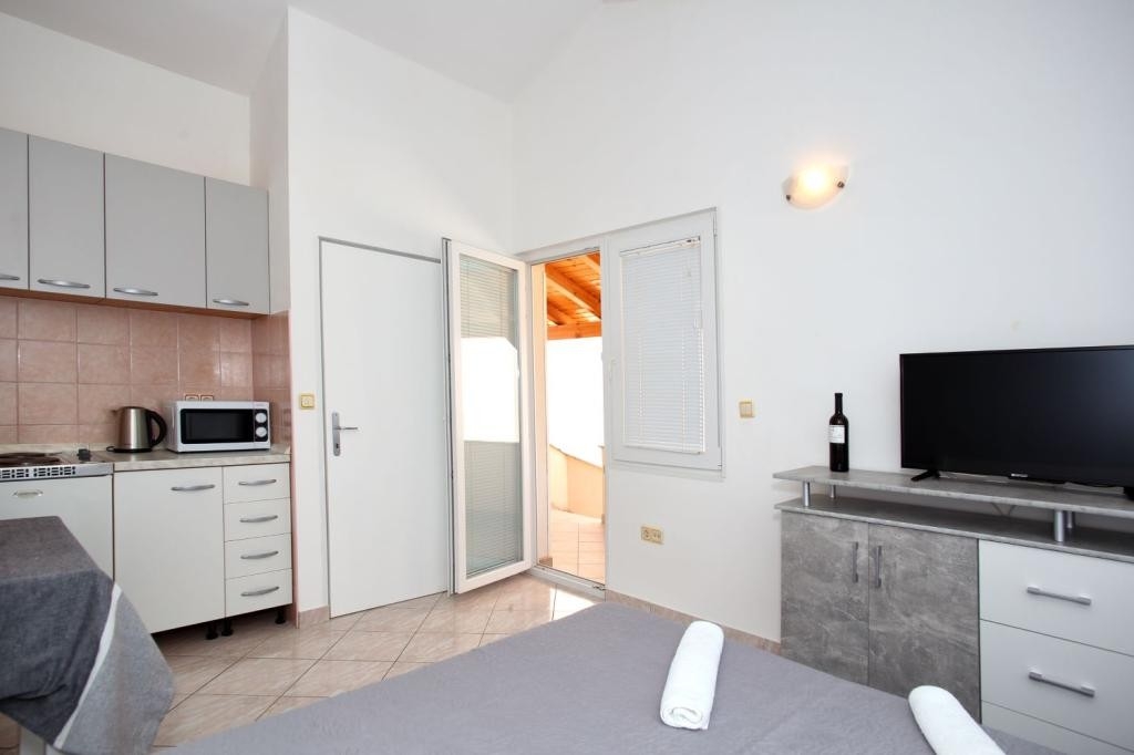 Studio flat can accommodate 2 guests. Beds are situated in 1 sleeping rooms, within 18m2. Guests can use a private balcony to enjoy the warm summer evenings. Food can be prepared using barbecue which is shared with other guests too. INCLUDED IN THE PRICE: tourist tax, final cleaning, air-conditioning, parking, internet, baby cot, iron, hairdryer, sunshade. OPTIONAL ADDITIONAL COSTS: garage (€10.00 per night). The availability of additional services for your chosen dates of stay, as well as their prices (if none are listed) must be checked ahead of time. Any additional services not shown in the price calculation are payable directly to the property owner and only if used by the visitor.