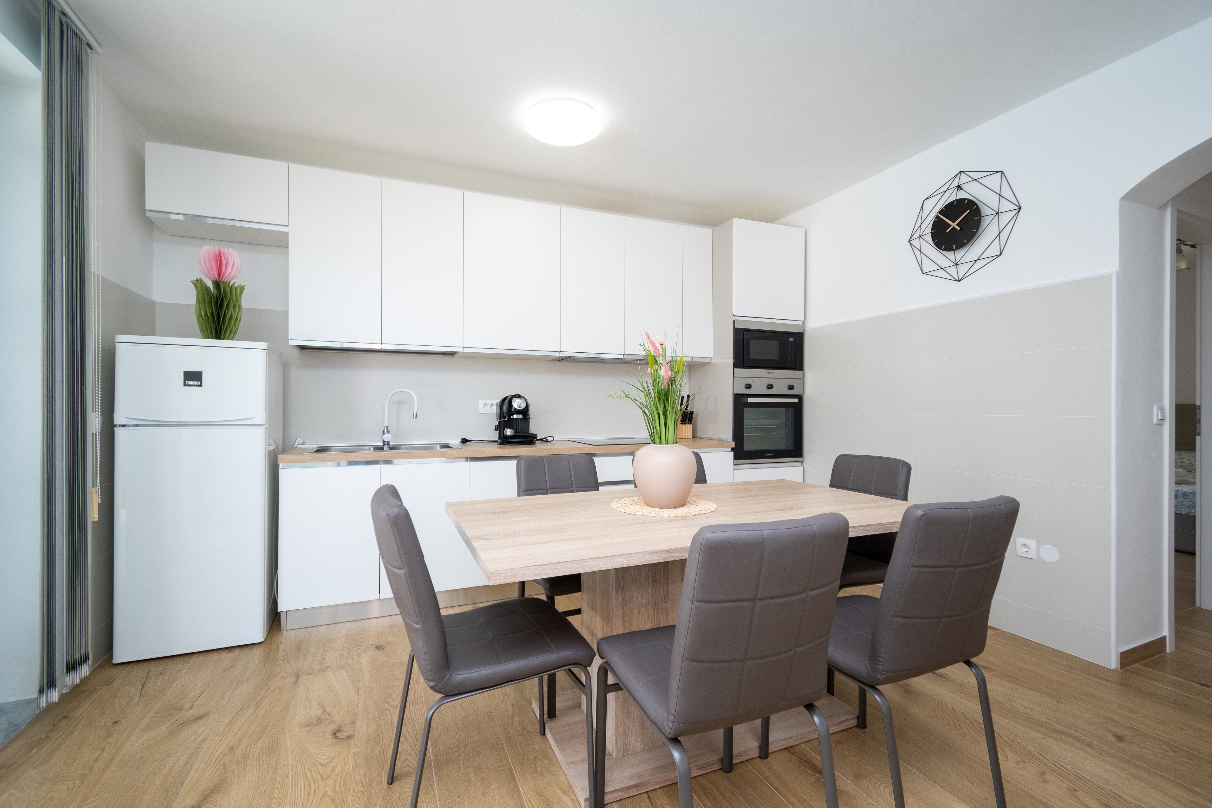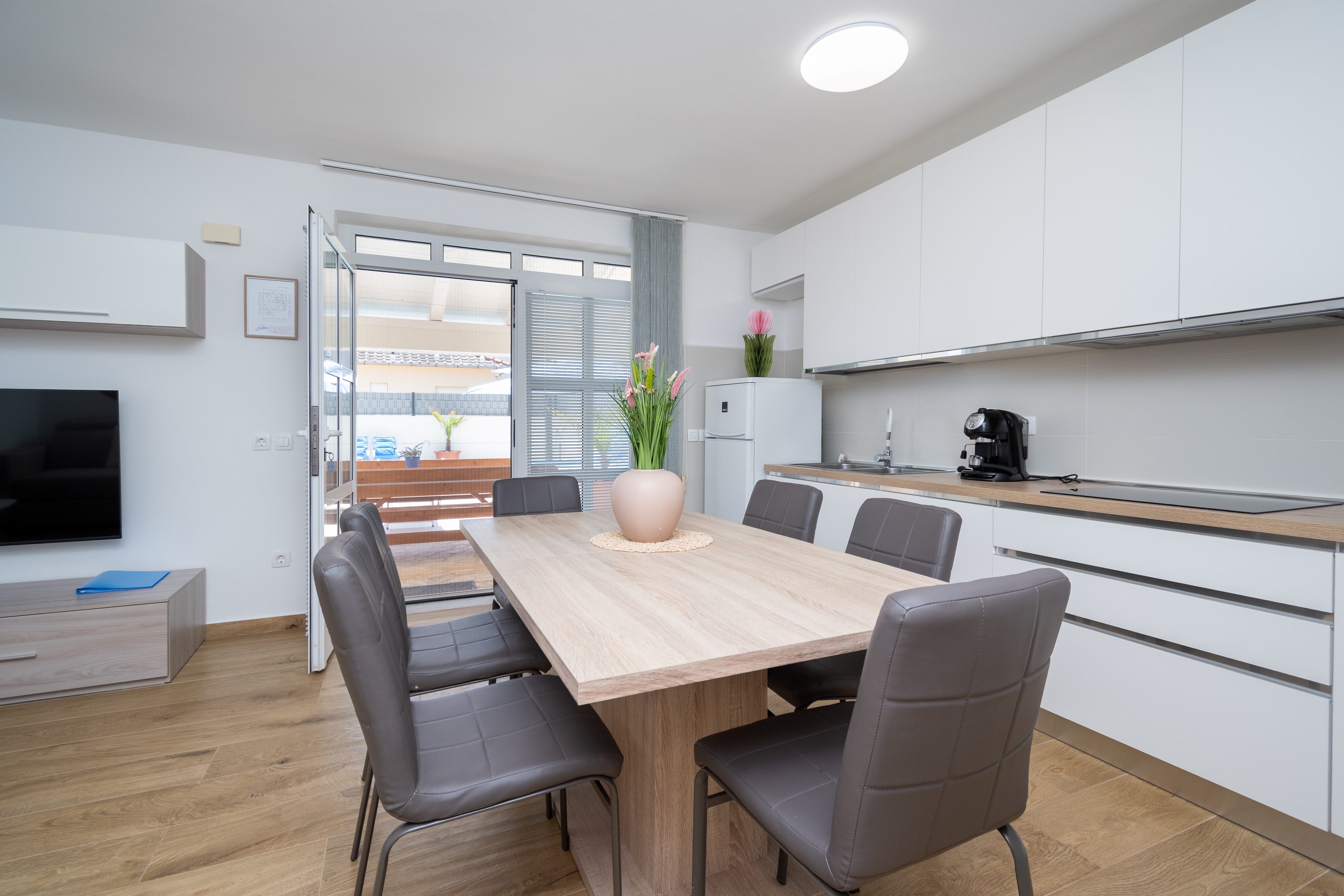 Apartment can accommodate 4 guests. Beds are situated in 2 sleeping rooms, within 56m2. Guests can use a private terrace to enjoy the warm summer evenings. Food can be prepared using barbecue which is shared with other guests too. During stay, there is a private pool for relaxation and pleasure. INCLUDED IN THE PRICE: tourist tax, final cleaning, air-conditioning, pool, parking, internet, baby cot, iron, ironing board, hairdryer, 2 beds for children (included in the price). The availability of additional services for your chosen dates of stay, as well as their prices (if none are listed) must be checked ahead of time. Any additional services not shown in the price calculation are payable directly to the property owner and only if used by the visitor.